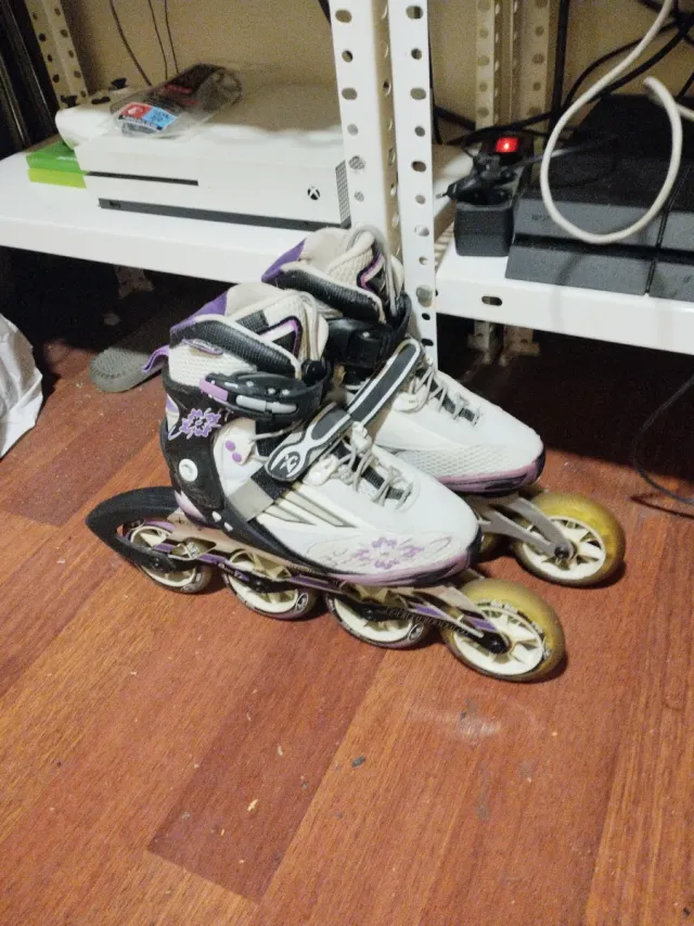 Patines en línea para mujer, talla 36-37. - Diseño blanco con detalles morados. - Cierre de velcro y cordones. - Ruedas de patinaje en línea.