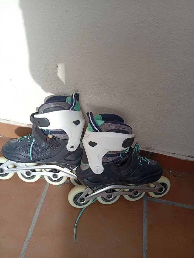 Se venden patines en línea en buen estado. Son cómodos y perfectos para disfrutar del patinaje. - Talla 38. - Diseño moderno en color gris y verde.
