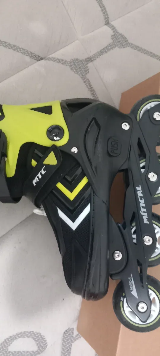 Patines en línea ajustables para tallas 38 a 42. Diseño moderno en negro y amarillo. - Cierre de velcro y hebilla. - Ruedas de poliuretano. - Rodamientos ABEC-5.