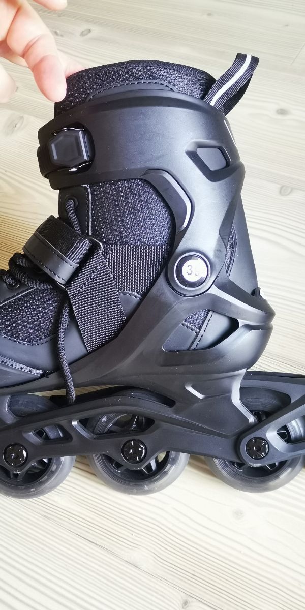 Patines en línea usados una sola vez, en perfecto estado. - Color negro. - Talla 39. - Sistema de cierre con hebilla y velcro. - Ruedas en perfecto estado.