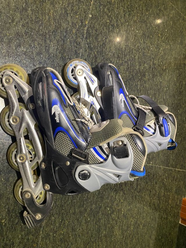 Patines en línea de color negro, azul y gris. - Talla 39. - Cierre con velcro y cordones. - Ruedas de poliuretano.