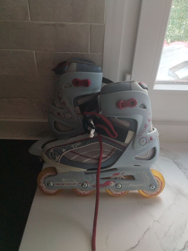 Detalles del productoPatines en línea de color azul claro con detalles en gris y rojo. Perfectos para disfrutar del patinaje.