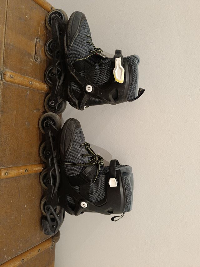 Patines en línea en color gris y negro, talla 42. - Cierre de velcro y hebilla. - Ruedas de poliuretano. - Diseño deportivo. Regalo protecciones y bolsa.