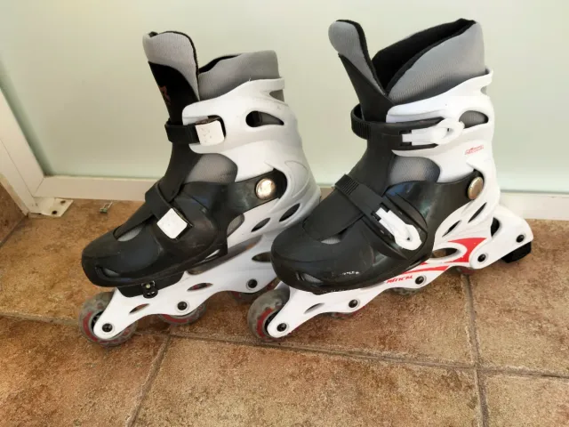 Se venden patines en línea con diseño moderno y cómodo. - Color principal blanco y negro. - Cierre de velcro y hebilla. - Ruedas de poliuretano.
