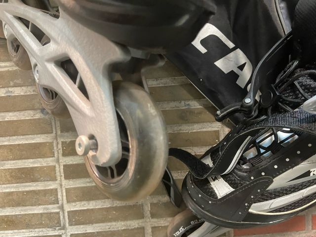 Patines en línea en buen estado, listos para usar. - Marca: No especificada en la imagen. - Color: Negro y plateado. - Se incluyen dos patines.