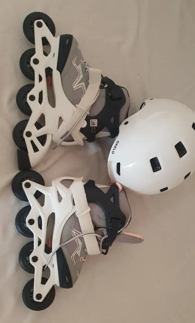 Set de patines en línea y casco de protección para niños. - Patines Oxelo blancos y grises con ruedas negras. - Casco Oxelo blanco con ventilación.