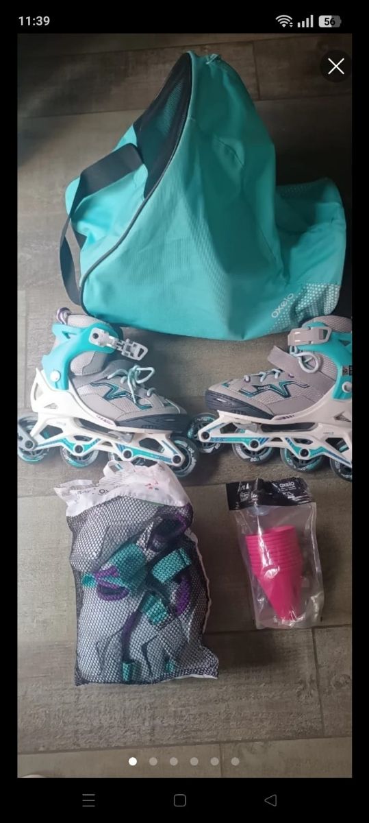 Detalles del productoSet de patines en línea con bolsa de transporte y equipo de protección.