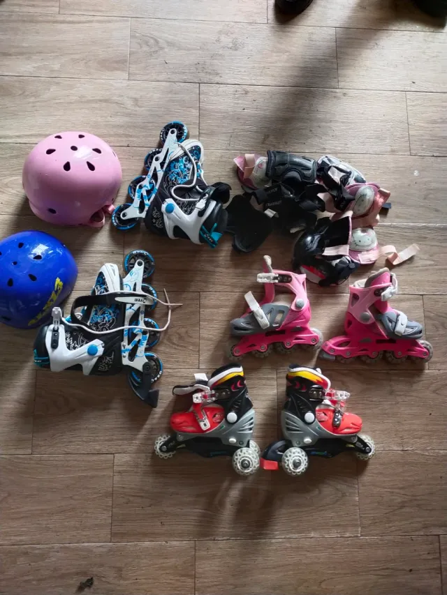 Detalles del productoLote de patines en línea y equipo de protección para patinar.