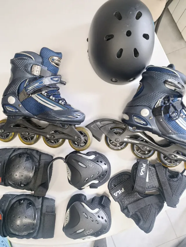 Set completo de patines en línea y equipo de protección. - Patines en línea de color azul y negro. - Casco de protección negro. - Rodilleras y coderas. - Muñequeras.