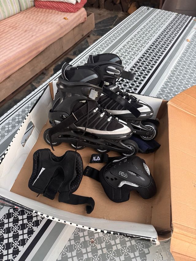 - Incluye un par de patines Fila y protecciones para rodillas y codos.