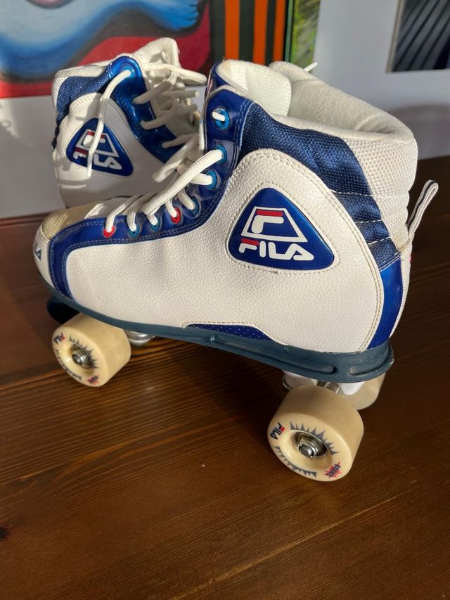 Patines de la marca Fila con un diseño deportivo en blanco y azul. - Diseño de bota alta. - Cierre con cordones. - Ruedas de color crema.