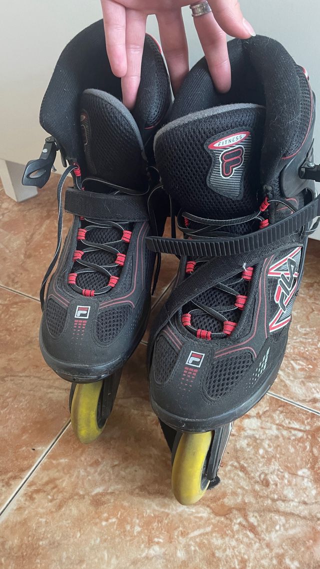 Patines en línea Fila para adulto, ideales para fitness. - Color negro con detalles en rojo. - Cierre con cordones y correas. - Ruedas amarillas
