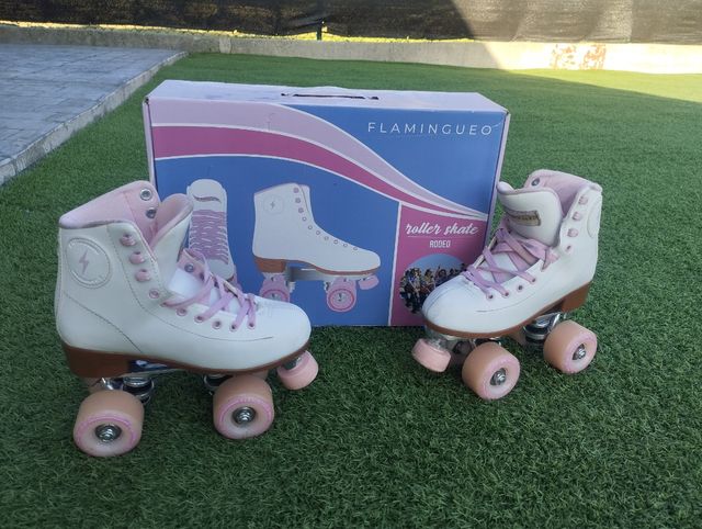 Detalles del productoPatines en línea Flamingueo Rodeo, talla 35, color blanco con detalles rosas. Están prácticamente nuevos, con muy poco uso.