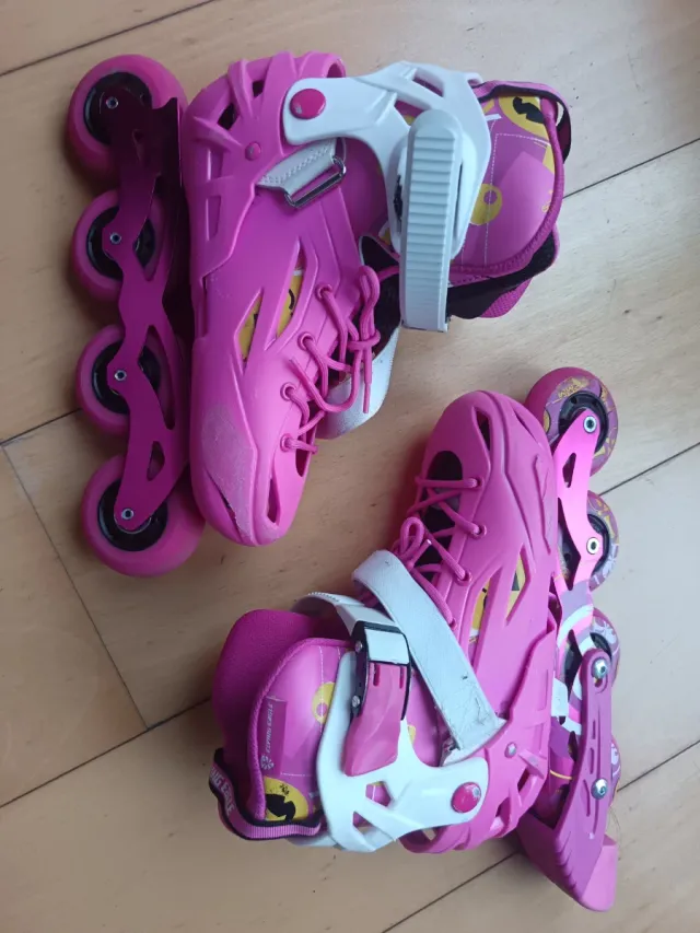Detalles del productoSet de patines en línea de color rosa, ideales para iniciarse en el patinaje.