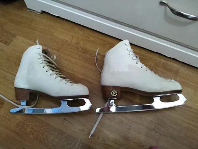 Patines de hielo para mujer de la marca Kingston. Diseñados para patinaje artístico. - Color blanco. - Cierre con cordones. - Hoja de acero pulido.