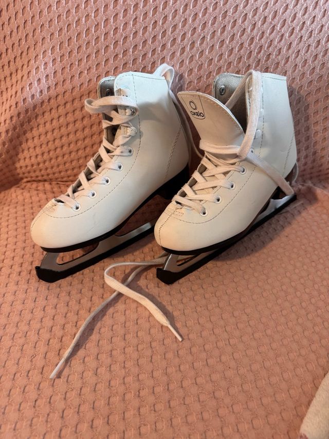 Patines de cuchilla blancos, talla 33. - Cierre con cordones. - Diseño alto para soporte del tobillo. - Cuchillas de metal.