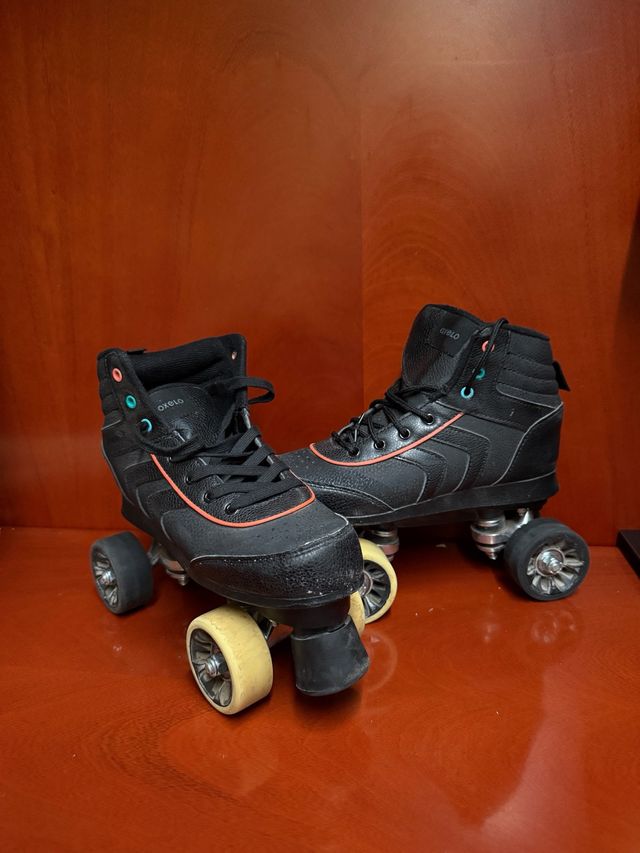Patines de hockey para iniciación de la marca Oxelo. Talle 38 - Color negro con detalles en naranja y turquesa. - Cierre con cordones. - Ruedas profesionales