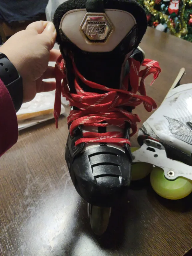 Patines de hockey en línea. - Modelo FZ-3. - Cordones rojos. - Ruedas verdes.