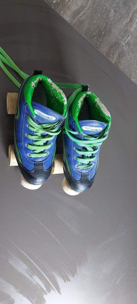 Patines de hockey en línea, talla 38. Diseñados para ofrecer buen rendimiento y comodidad. - Color azul y verde. - Cordones verdes. - Ruedas de color claro.