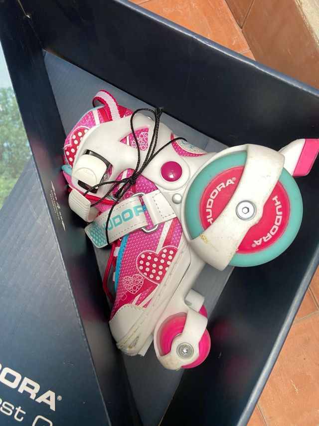 Detalles del productoPatines en línea para niña de la marca Hudora, con un divertido diseño de corazones rosas y blancos.