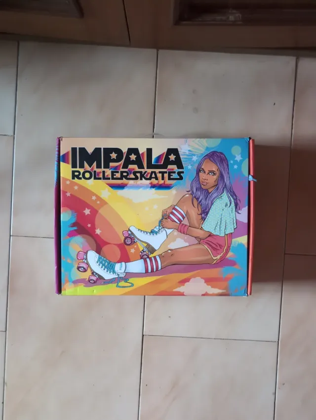Patines de cuatro ruedas de la marca Impala. - Talla 38. - Diseño colorido con ilustración. - Ruedas de color rosa. Usados una vez