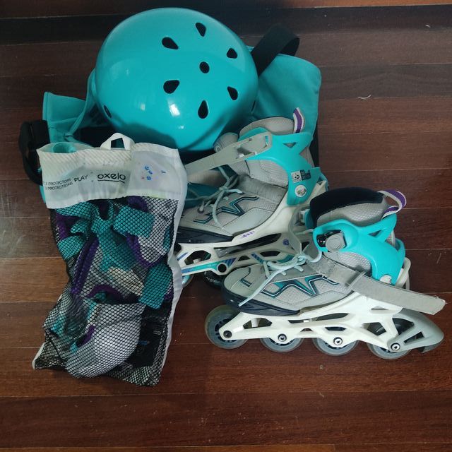 Patines infantil. Tallas 32 a 35. Con bolsa, llaves y taco de freno de repuesto. Bolsa de transporte, casco, rodilleras y coderas.