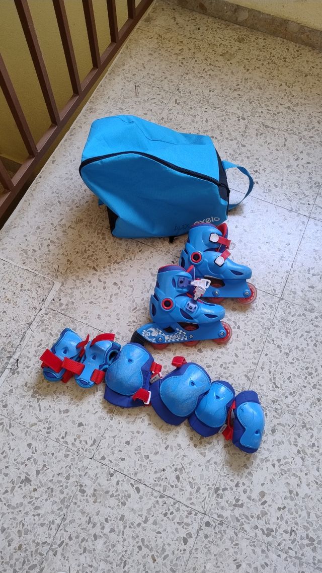 Detalles del productoPatines en línea para niños, en buen estado. Incluye un par de patines y un juego de protecciones (rodilleras, coderas y muñequeras). Todo en color azul y rojo. - Patines ajustables. - Protecciones acolchadas. - Bolsa de transporte incluida.