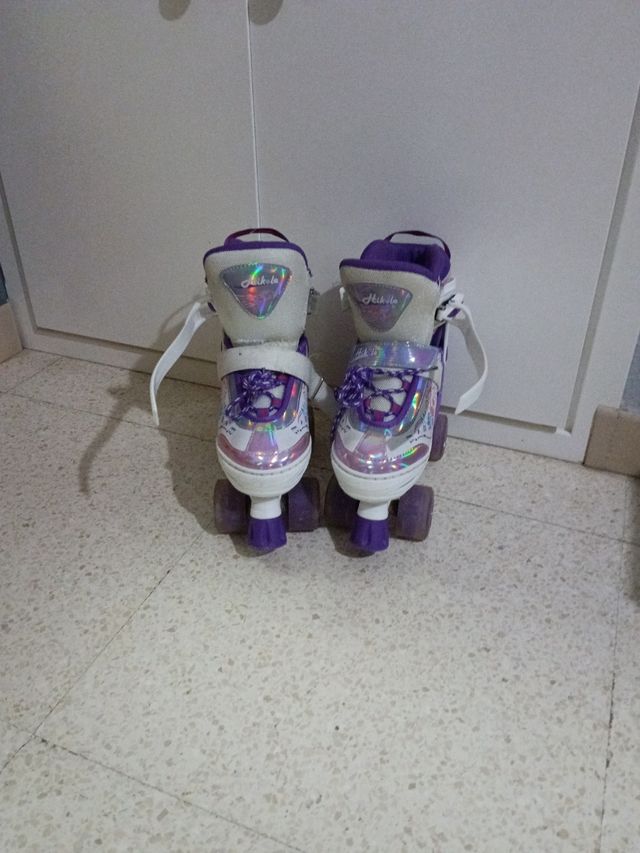 Patines de cuatro ruedas para niñ@s, en muy buen estado. Ideales para principiantes. - Talla 34 - Color morado y blanco - Diseño con purpurina