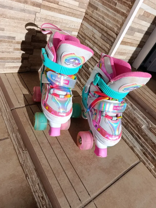 Detalles del productoPatines de cuatro ruedas con un diseño divertido de unicornio y arcoíris.