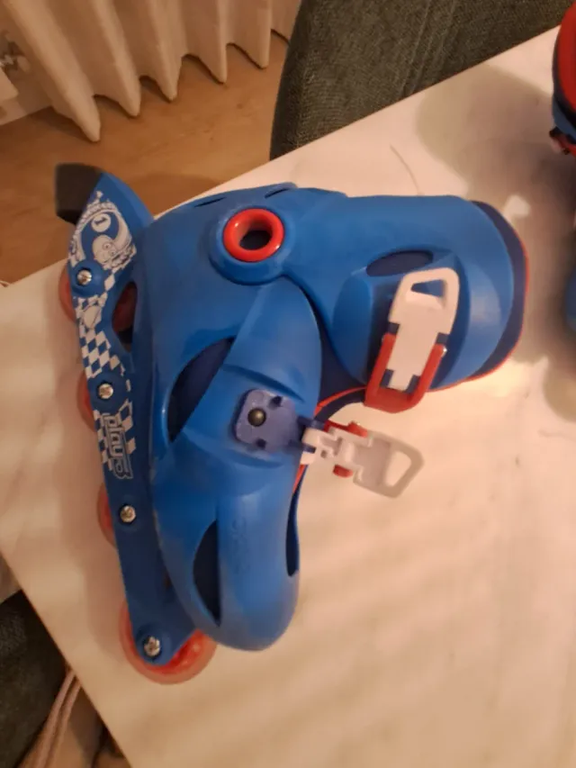 Detalles del productoPatines infantiles de color azul, diseñados para niños. Cuentan con un sistema de ajuste para adaptarse al crecimiento.