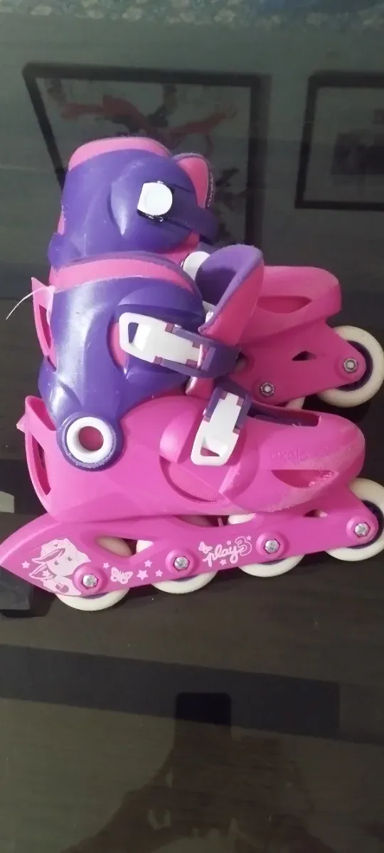 Detalles del productoConjunto de patines infantiles para niña en colores rosa y morado. Son ajustables para adaptarse de la talla 30 a la 32.