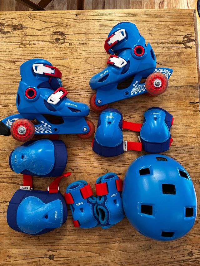 Detalles del productoConjunto de patines y protecciones para niños de la marca Oxelo. Ideales para aprender a patinar