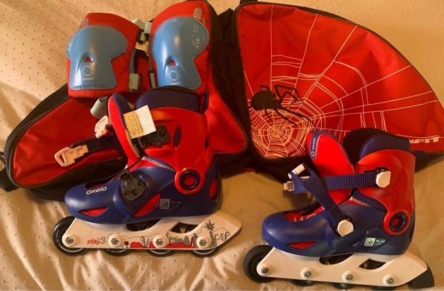 Patines infantiles en línea de la marca Oxelo, talla 30-32. Con rodilleras y funda.