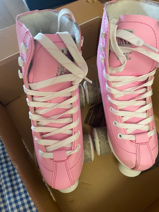 Detalles del productoPatines en línea infantiles de cuatro ruedas, color rosa. Están en buen estado, aunque presentan algunas señales de uso.