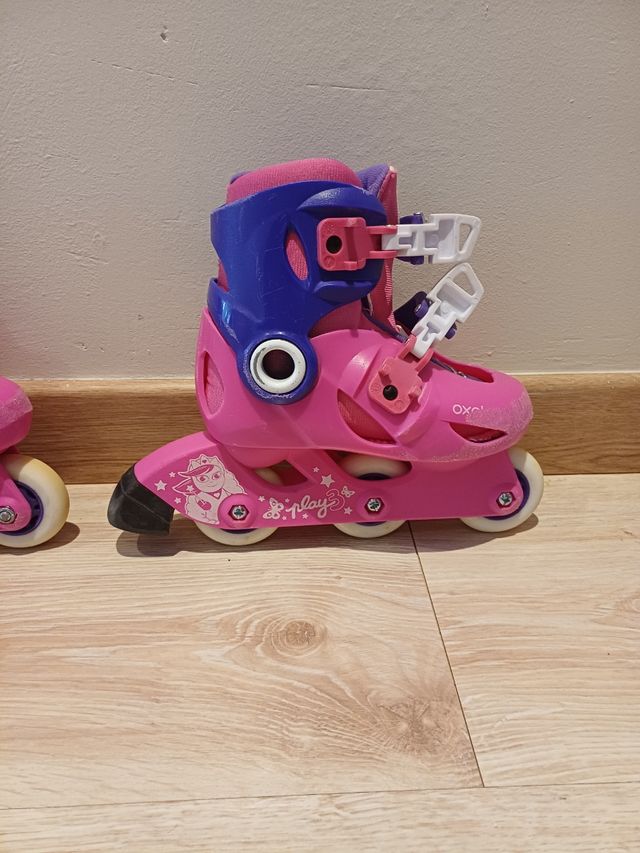 Patines de iniciación para niños, con un diseño divertido y ajustable. - Color rosa y azul. - Cierre de velcro y hebilla. - Ruedas de poliuretano.