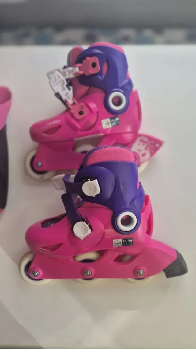 Detalles del productoPatines de niña en color rosa y morado, perfectos para iniciarse en el patinaje.