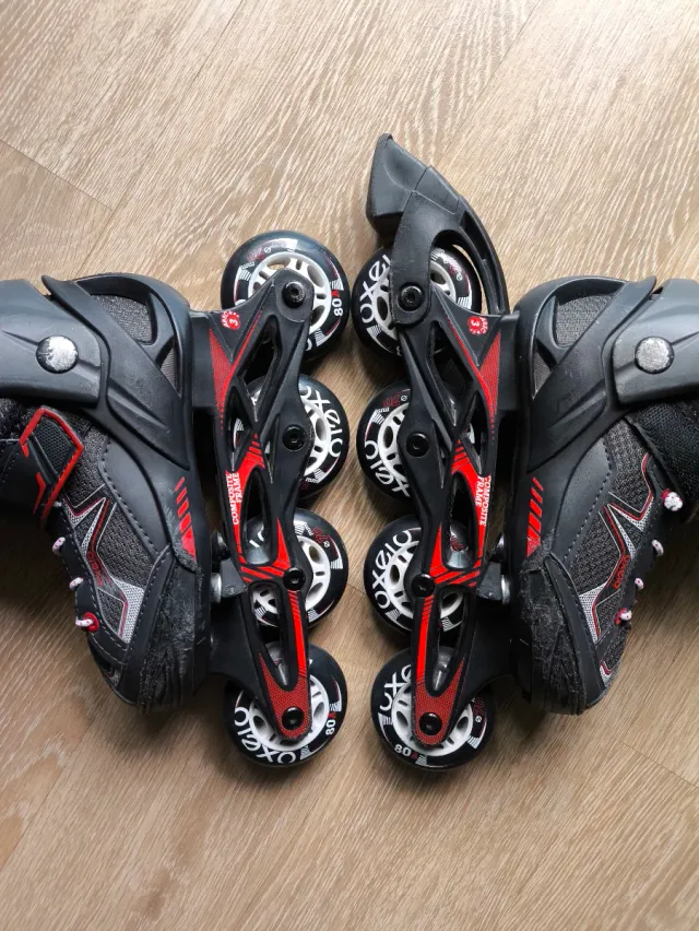 Patines en línea para niños, ajustables en talla. - Talla: 29-32 - Color: Negro con detalles en rojo - Ruedas: 4 por patín - Cierre: Cordones y hebillas