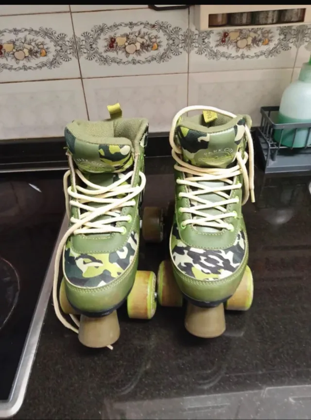 Patines infantiles con un diseño de camuflaje en tonos verdes y beige. Perfectos para iniciarse en el patinaje. - Talla: 35/36 - Diseño: Camuflaje - Cordones: Blancos