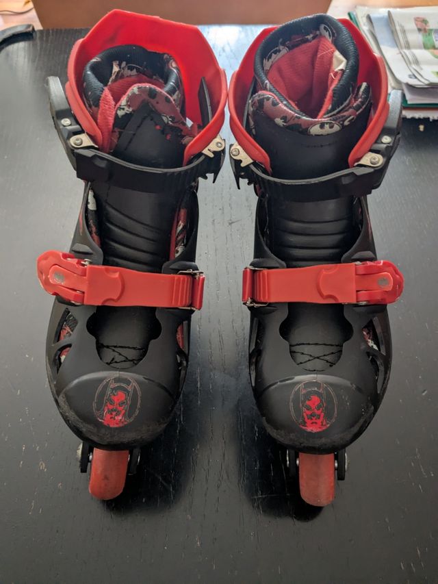 Detalles del productoPatines en línea para niños, usados pero en buen estado. Son de color negro y rojo, con un diseño llamativoy logo de Batman talla 29/32