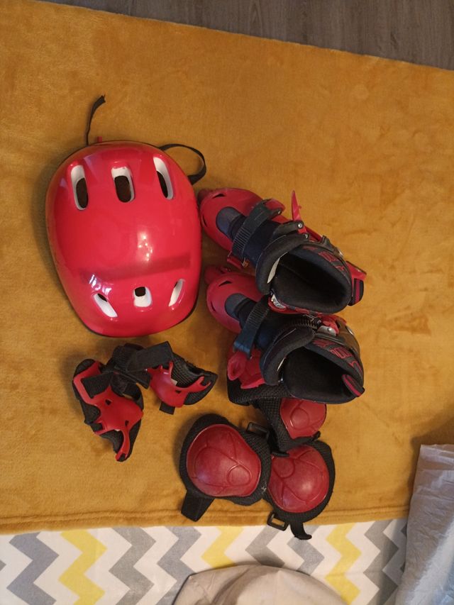 Patines ajustables. Incluyen casco y protecciones (mano, codo, rodilla)