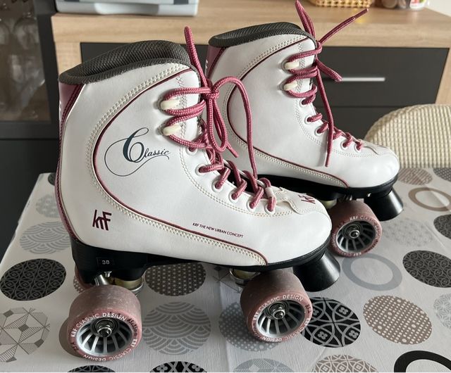 Detalles del productoPatines KRF Classic de cuatro ruedas en color blanco y detalles en burdeos.