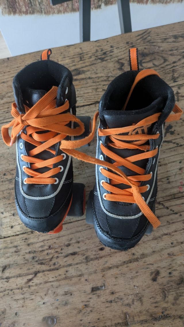 Detalles del productoPatines 4 ruedas KRF para niños, en color negro y naranja. Están en buen estado, con algunas señales normales de uso. (Punteras gastadas, pero no rotas/ freno desgastado (se puede cambiar)