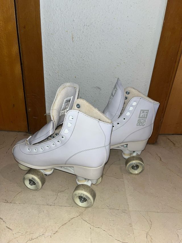 Patines blancos de la marca KRF School, talla 38. - Diseño clásico de bota alta. - Ruedas de patinaje. - Cierre con cordones. - Solo 3 usos - No trae cordones