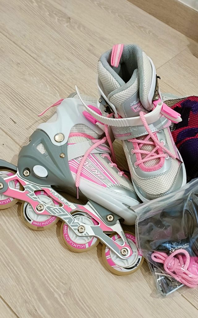 patines de línea número 34 ajustables hasta 35-36, solo se han usado dos veces los protección también están nuevas y entran en el precio
