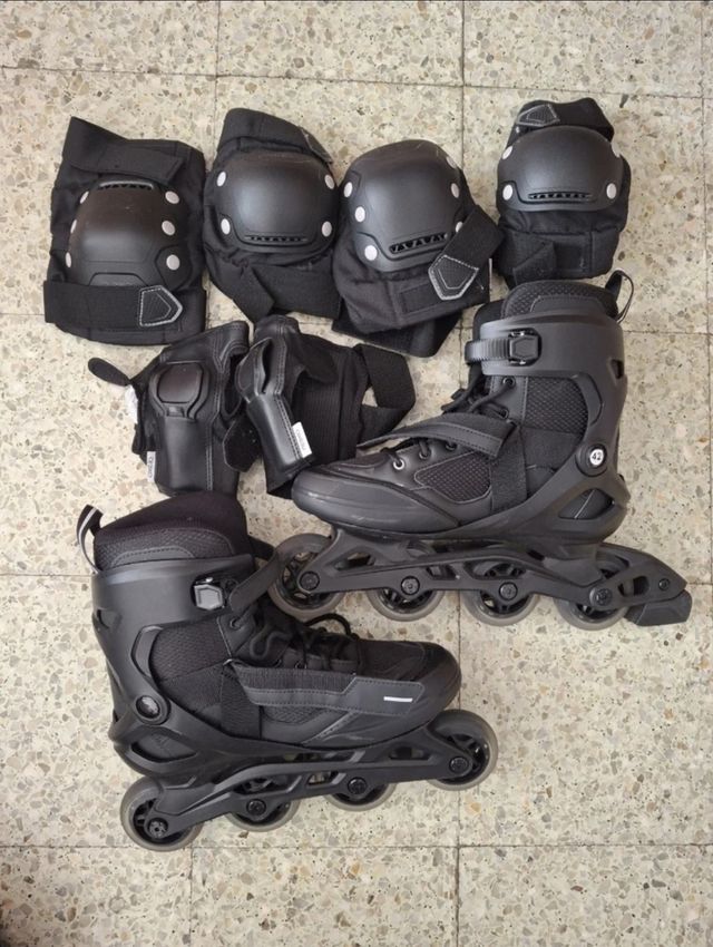 Vendo Patines talla 42 marca Oxelo junto a protecciones de muñeca, rodillas y codos Un mes de uso , cuatro clases de patinaje
