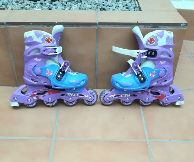 Patines de ruedas de la marca Mitical en color morado y azul. - Talla ajustable - Diseño con mariposas y flores. - Cierre de velcro y hebilla. - Ruedas resistentes.