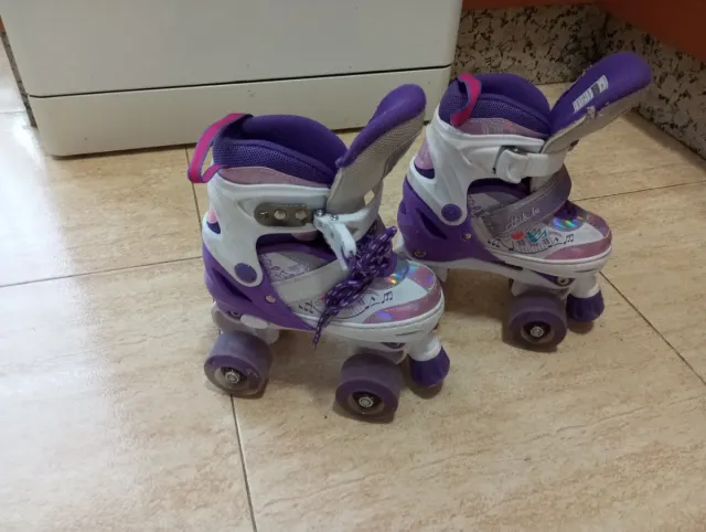 Se venden patines en buen estado, ideales para iniciarse. - Talla ajustable de la 27 a la 30. - Diseño en color morado y blanco. - Cierre con cordones y velcro.