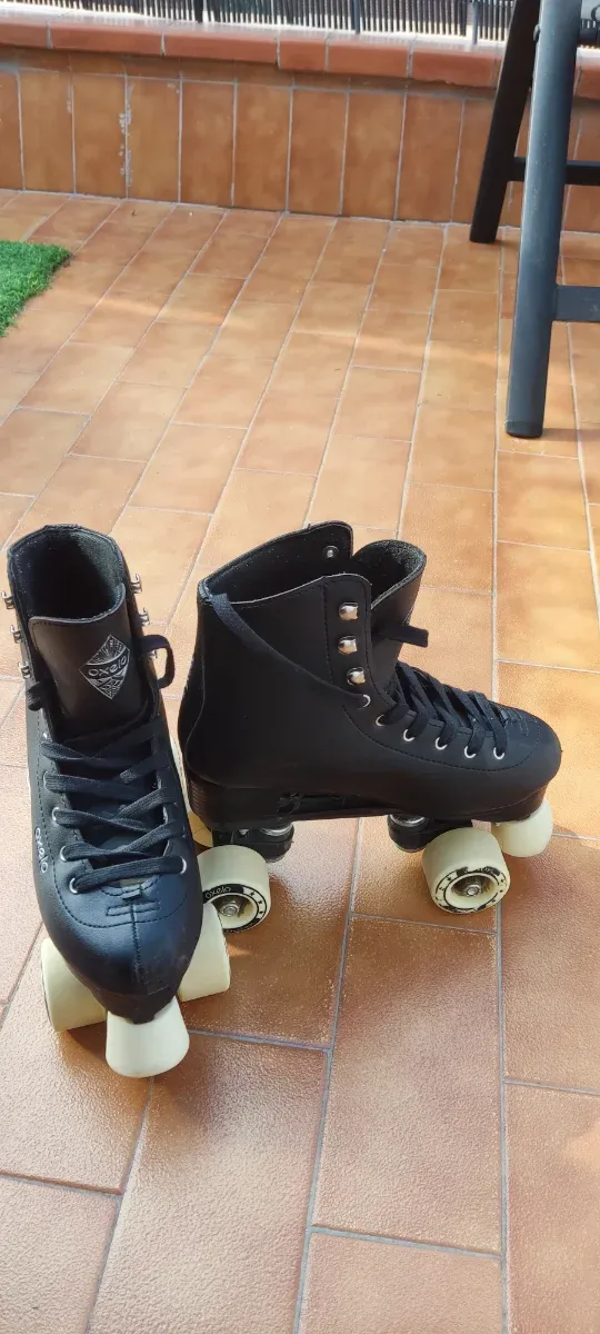 Par de patines de cuero negro. - Diseño clásico de bota alta. - Cordones negros. - Ruedas de color crema. Un freno algo gastado