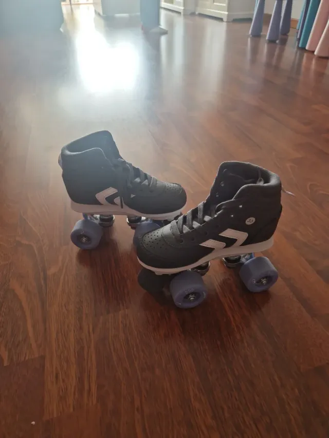 Se venden patines de estilo alto en color negro. 4 ruedas - Diseño moderno con detalles blancos. - Ruedas de color azul. - Cierre con cordones.