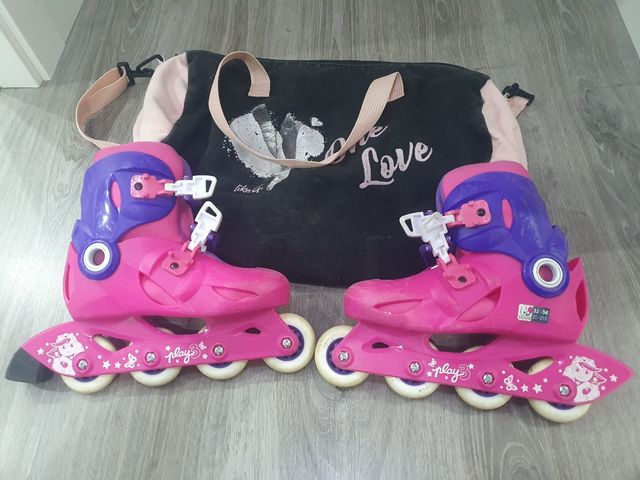 Por quedarse pequeños, incluye la mochilita para el transporte, talla 32-34 Cuatro ruedas en linea, estan en perfecto estado, el uso típico